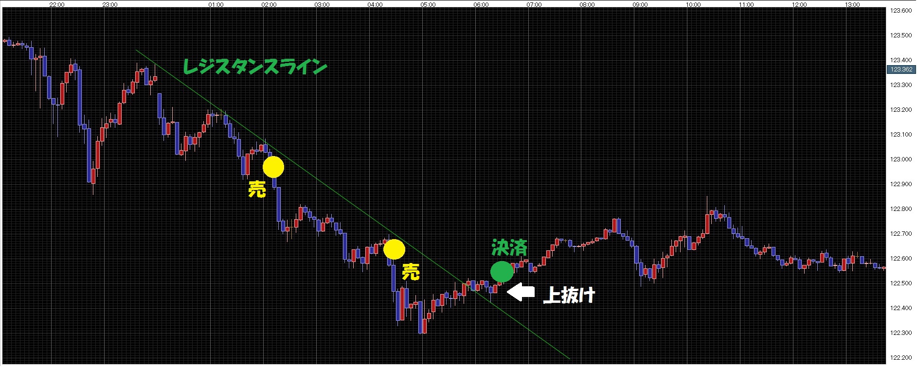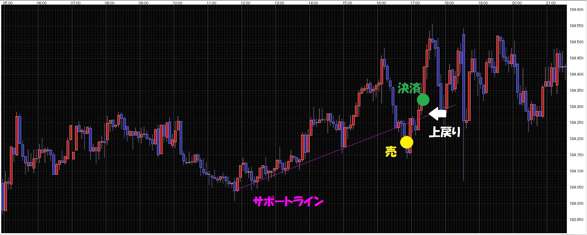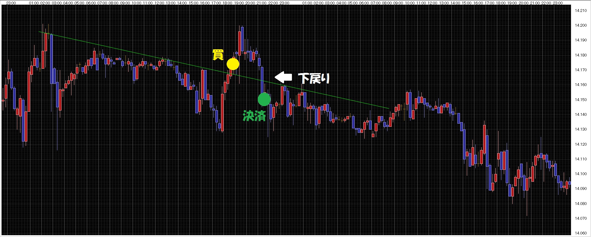 4、下降ラインを超えた所で新規買いのあと、ラインを割り込んだら決済。(損切り)