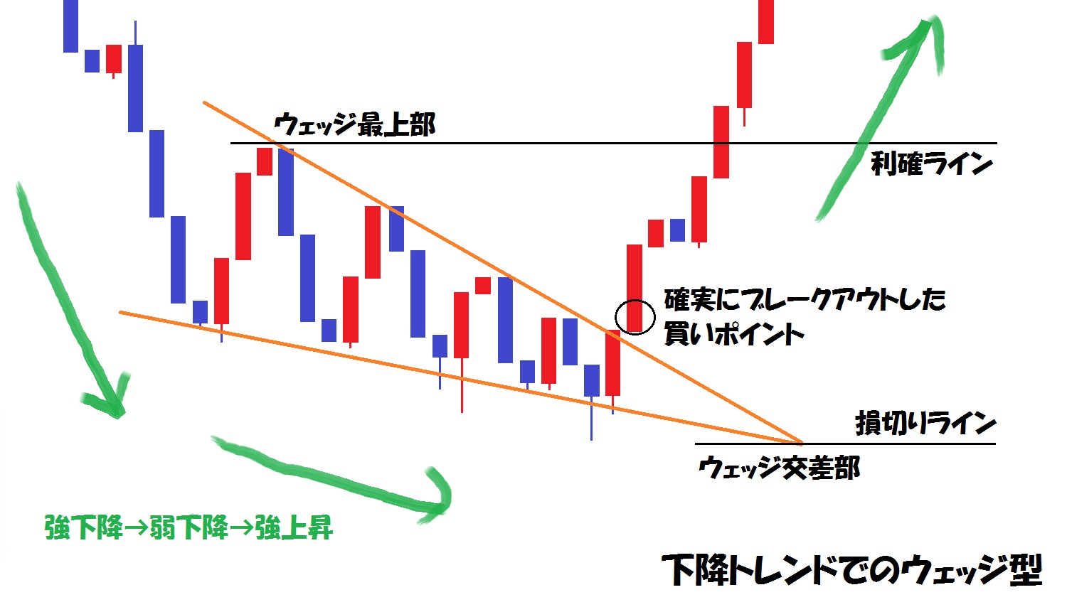 下降トレンドで、焦点が下向きのウェッジはこの逆の考え方になります。